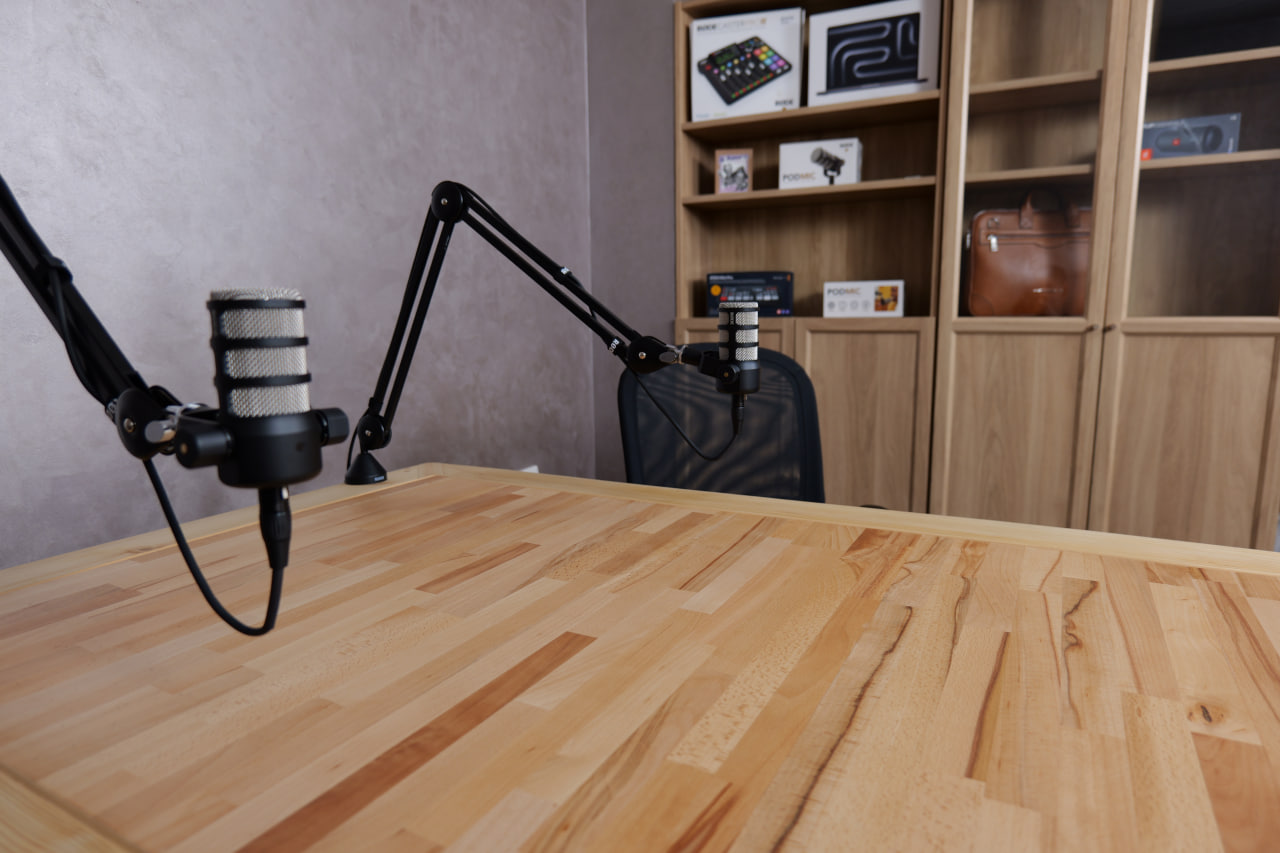 - 2× RODE PodMic studijska mikrofona (na boom rukama) 2× RODE PodMic broadcast microphones (on boom arms)